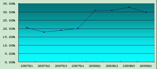 3.银保业务快速扩张。2008年1季度银保业务实现保费收入同比增长128.71%,2季度同比增长159.58%,3季度同比增长158.27%,4季度同比增长106.53%。但从4季度开始,银保业务增幅明显下降,代理保费占全国总保费比例为29.77%,与上季度相比,下降了近3个百分点。