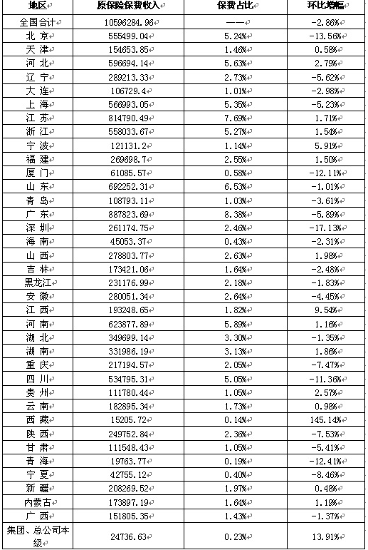 2011年5月全国各地区原保险保费收入情况表