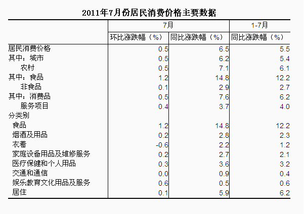 2011年7月份,全国居民消费价格总水平同比上涨6.5%。其中,城市上涨6.2%,农村上涨7.1%;食品价格上涨14.8%,非食品价格上涨2.9%;消费品价格上涨7.6%,服务项目价格上涨3.7%。全国居民消费价格总水平环比上涨0.5%。其中,城市上涨0.5%,农村上涨0.5%;食品价格上涨1.2%,非食品价格上涨0.1%;消费品价格上涨0.5%,服务项目价格上涨0.4%。