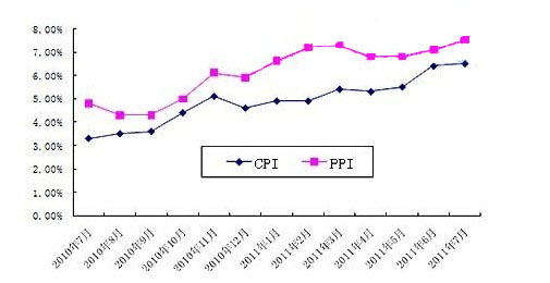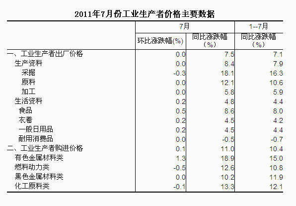 2011年7月份,全国工业生产者出厂价格与上月持平,比去年同月上涨7.5%。工业生产者购进价格比上月上涨0.1%,比去年同月上涨11.0%。