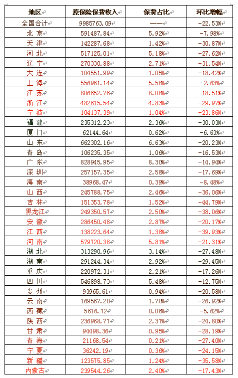 2011年7月全国各地区原保险保费收入情况表