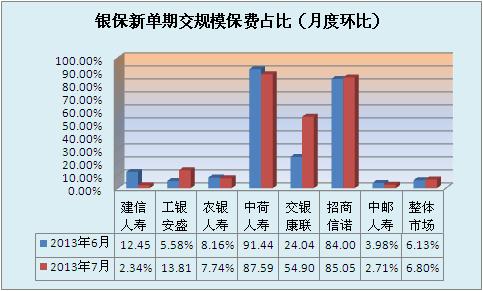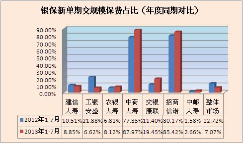 此外,成立于2009年的中邮人寿,虽然不是银行系保险公司,但是借助于邮政集团的优势,在2012年就挺进寿险前十强。今年1-7月中邮人寿银保新单规模保费收入达201亿元,同比增长127%,从7月新单期交占比看,仅为2.71%