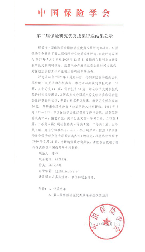 附件下载:1、评委名单 2、第二届保险研究优秀成果评选获奖结果