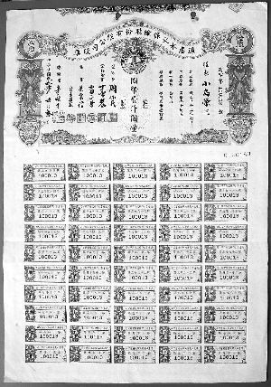 如图所示,这张中华民国叁拾肆年柒月签发的“通惠水火保险股份有限公司股票”,股额拾股,国币壹千元整,编号为“通字100013”,持股股东为日本人小岛荣三。票面由绿色花饰、花球围成边框,正中上方有“通惠水火保险股份有限公司股票”标注和司徽图案,四角有股额“拾股”标识,董事长、常务董事、董事和总经理均有正规签章,中间股数金额上钤印公司钢印,采用添加彩色纤维丝的特用纸张,印刷精美。背面有“摘录本公司章程”。