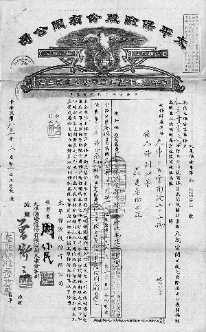 太平洋保险股份有限公司1943年12月由交通银行在重庆发起成立,抗战胜利后,迁到上海,在保单上可以看出,总公司位于上海四川路四行储蓄会六楼。因此,才会有太平洋保险股份有限公司的旧保单在上海附近的嘉兴地区出现。